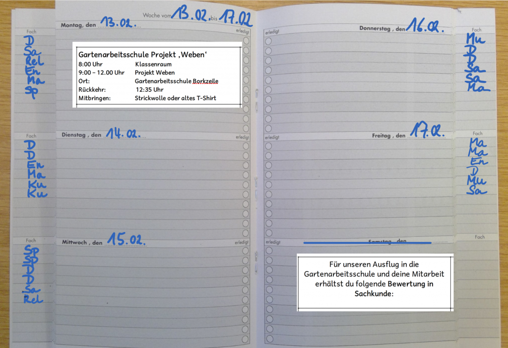 - Der Umgang mit dem Hausaufgabenheft muss geübt werden. Die Aufgabe lautet daher, den Stundenplan für alle Tage bis zum 03.03.2023 einzutragen. Außerdem muss das Datum des jeweiligen Tages eingetragen werden. Unsere Wochen gehen immer von Montag bis Freitag (Beispiel: Die Woche vom 06.02. bis zum 10.02.). Wir haben den Umgang mit dem Hausaufgabenheft heute ausführlich geübt. Wenn’s noch nicht perfekt klappt, ist das kein Problem. Aber jede/r muss üben, üben, üben! : )