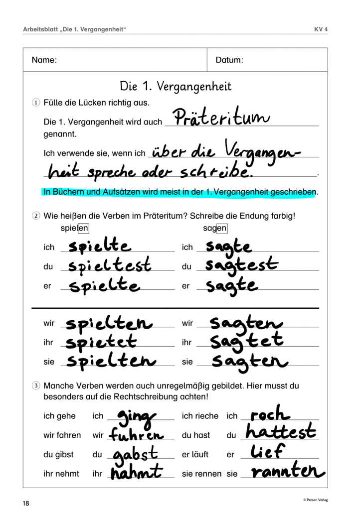 - Sätze im Präteritum (Arbeitsblatt). Auch hier gilt: Falls die unregelmäßigen Verben falsch gebildet werden, ist das kein Problem. Jedoch sollte jede/r für jedes Verb einen Satz aufschreiben.