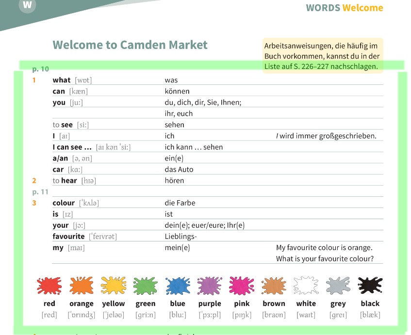 Wir haben in der letzten Woche angefangen, die ersten Vokabeln zu lernen. Konkret geht um die Vokabeln der Seite 262 im grün-weißen Textbook. Die Schüler sollen von „what“ bis „black“ alle Vokabeln bis Donnerstag, den 14.09.2023, lernen. Die Vokabeln werden ab Donnerstag wöchentlich erneuert und abgefragt.