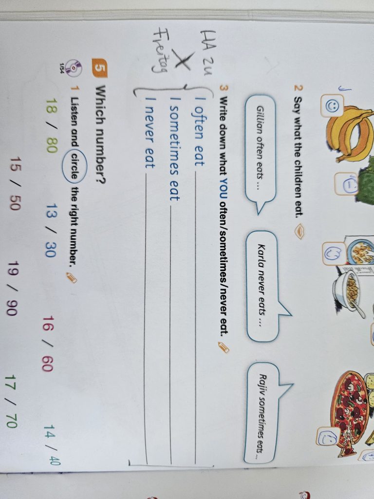 Workbook (große pinke Heft), Seite 30, Aufgabe 4.3: „Write down what YOU often / sometimes / never eat!
