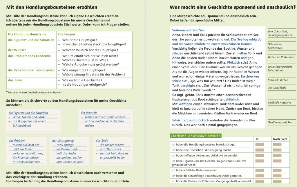 Deutsch – eine Geschichte erzählen. Wichtig: Die Geschichte muss die fünf Handlungsbausteine (siehe Bild) abdecken. Außerdem kommt es darauf an, Adjektive (ängstlich, neugierig, sorgenvoll, zögerlich, …) zu verwenden, um Gefühle zu beschreiben und Verben zu verwenden, die für Abwechslung und Spannung sorgen. Zum Beispiel im Bereich des Sprechens und Mitteilens: er sagte/schrie/rief/brüllte/meinte/schluchzte/warnte/flüsterte usw.